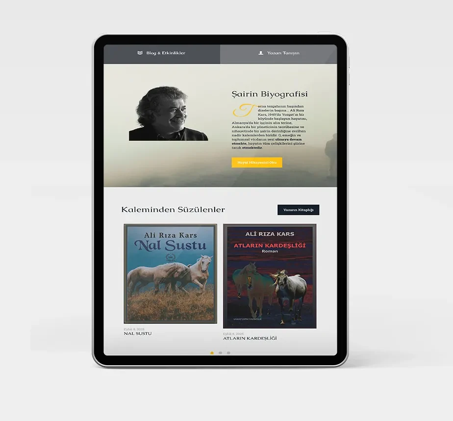 Ali Rıza Kars için oluşturduğumuz kişisel marka web sitesi, edebiyat ile teknolojiyi bir araya getiren dijital bir vitrin niteliğinde.